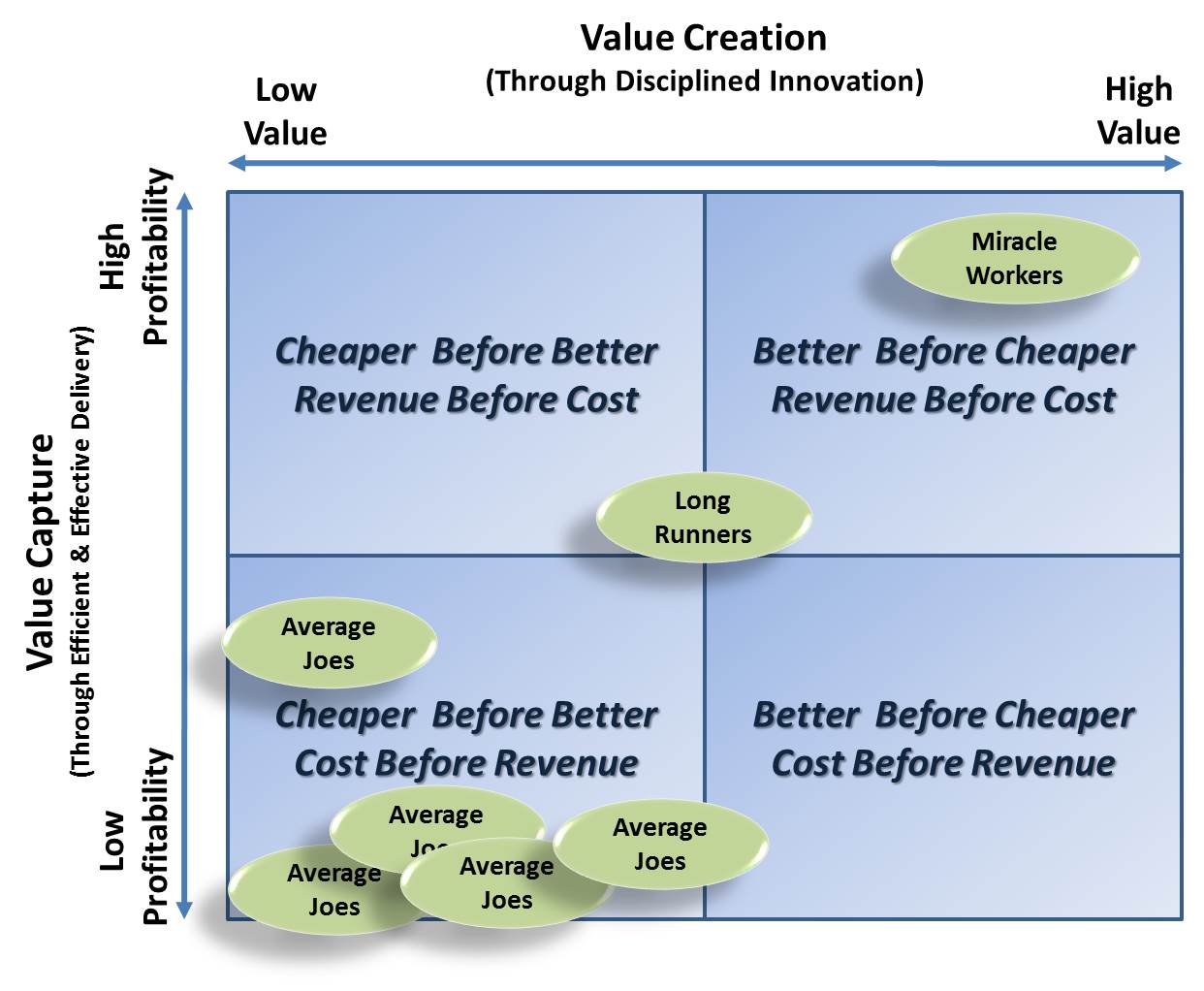 To help clarify how management can put the rules into action, Raynor and Ahmed’s performance categories can be mapped into a simple 2×2 framework that illustrates value creation and value capture. The ‘miracle workers’ were firms that consistently in the long run selected steps to be better before cheaper and revenue before cost to maximize value creation and value capture. The ‘Average Joes’ were firms that consistently in the long run selected steps be cheaper before better and reduce cost before improve revenue. The ‘Long Runners’ were firms that consistently fell within these extremes.