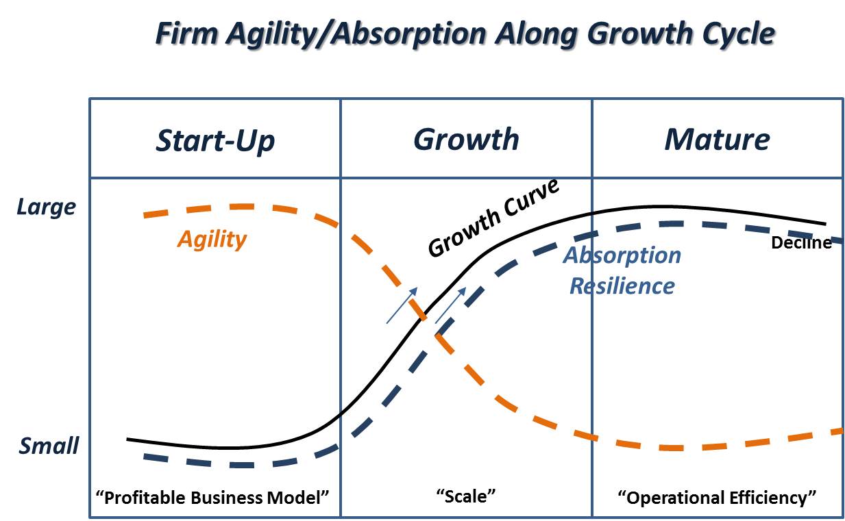 Using Syrett & Devine’s uncertainty management framework some of the leading approaches that are more appropriate for SMEs are worth identifying. Of the six components agility and absorption are the core approaches firm’s have traditionally adopted to survive a market VUCA crisis. Large firms possess greater absorption capabilities with less agility due to their size whereas SMEs on the other hand can exploit agility to compensate for their lack of absorption capabilities. The mix of agility and absorption available to management depends on where the firm is positioned on the growth cycle as shown below: